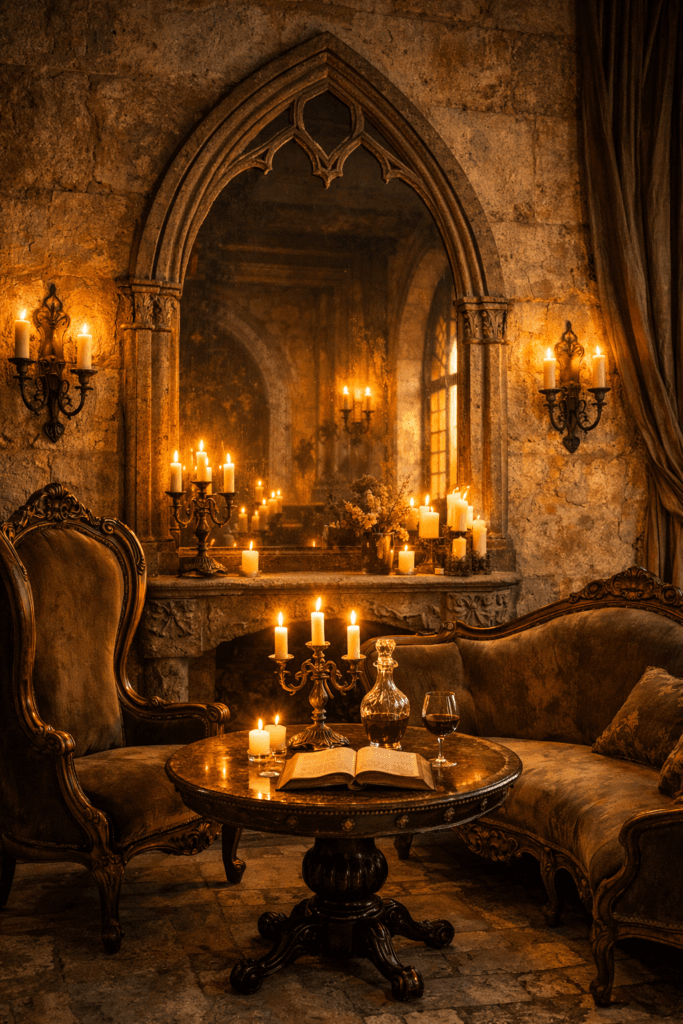 Mirrors, in particular, are powerful. They can suggest depth, reflect candlelight, and make small rooms feel more layered and mysterious.
