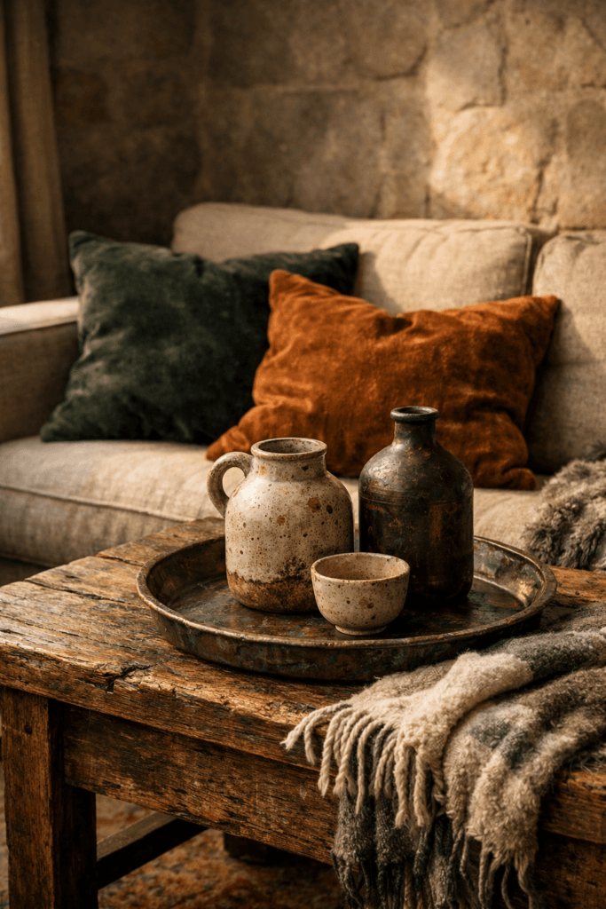 These colors feel architectural. They immediately suggest old walls, thick structures, and permanence. They also act as a perfect neutral base for richer accents like wood, metal, velvet, and linen.