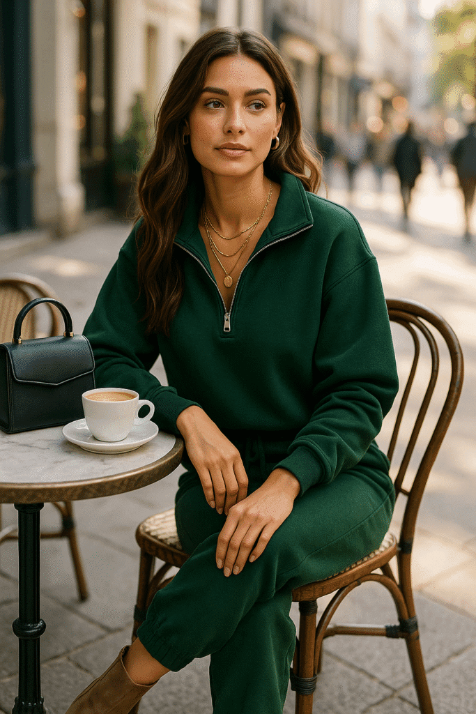 To turn this sweatsuit into a full street style statement, keep everything very intentional and very clean. Choose black or deep charcoal for a sharp base. Coordinate your sneakers, bag, and outerwear in a tight color story, such as black, white, and tan only. Zip the top just low enough to show a slim chain necklace and wear sleek sunglasses, even if it is not that sunny. A long wool coat in camel or gray layered over the set gives that high end, editorial feel. You can even stack bracelets or add chunky rings to lean into bold minimalism. This look is all about using the sweatsuit as a canvas for strong lines and a controlled palette, making it perfect for city days when you want to look cool but still feel relaxed.