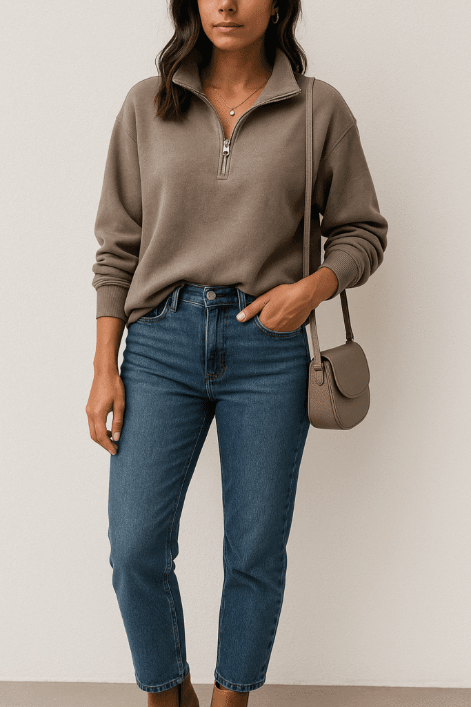 You do not have to keep the pieces together every time. The half zip sweatshirt looks amazing with high rise jeans, faux leather leggings, or even tailored joggers. Wear it slightly front tucked into straight leg denim and pair with ankle boots for a simple, pulled together fall outfit. On colder days, layer a fitted turtleneck underneath and let the collar and cuffs peek out for extra dimension. You can also zip the top all the way up and layer a trench coat on top for a clean, sleek look. Play with different bottoms and outerwear, and you will quickly see how this single top can anchor a whole row of outfits in your closet.