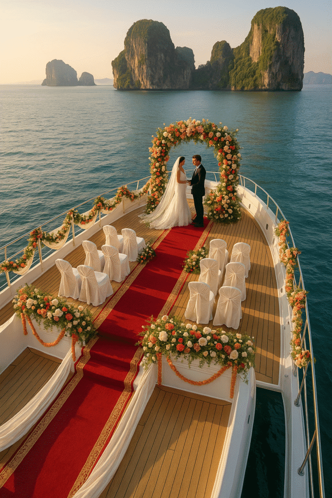 Sailing across Krabi’s coastline while exchanging vows is cinematic and unforgettable. Decorate the boat with Thai silk textiles, flower garlands, and lantern accents. Keep the guest count small to maintain safety and intimacy. Waterproof vow cards are essential. Drone footage transforms this idea into a visual masterpiece—especially with a color palette inspired by ocean tones: sage, ivory, teal, and coral.