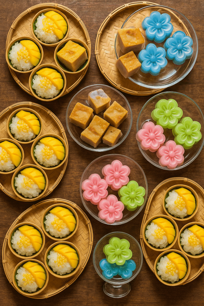 Swap the traditional cake for a colorful Thai dessert display featuring mango sticky rice cups, coconut pudding, taro custard bites, and miniature jelly flowers. Present them in tiered bamboo trays or glass stands for modern contrast. Add tiny printed cards explaining each dessert in both Thai and English—guests will love discovering new flavors. It becomes both dessert and decor—perfect for grazing and photos.