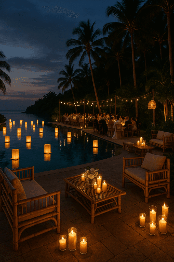 A long beachside table overlooking the ocean during golden hour sets the mood for a dreamy dinner. Keep decor minimal: neutral linens, woven chargers, hurricane candles, and fresh tropical leaves. Serve dinner after sunset—this avoids heat discomfort and enhances atmosphere. Welcome cocktails like lemongrass spritzers or coconut mojitos elevate the vibe. Unplugged dinners (no photos during the meal) help preserve ambiance and keep things feeling exclusive.