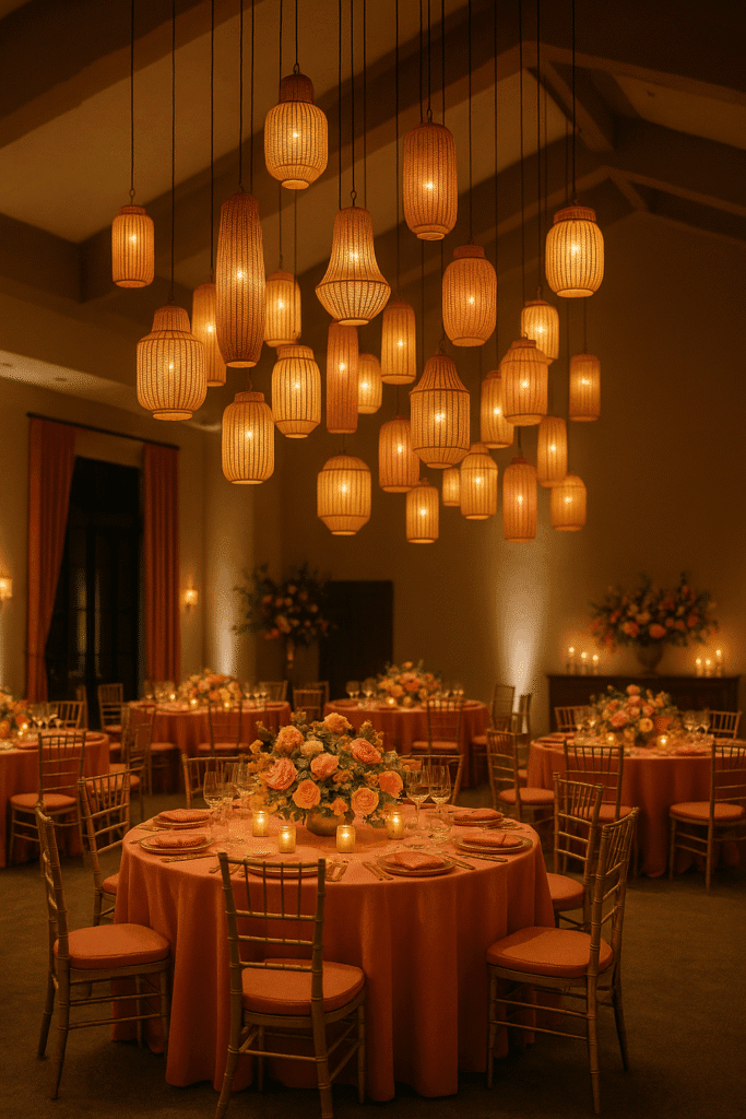 For indoor receptions, oversized lantern clusters bring depth and movement to ceilings. Use mixed sizes, warm tones, and layered heights for visual interest. Combine soft coral, muted gold, ivory, and amber for a palette that complements most venues. Dim the lights gradually throughout the evening to transition from dinner atmosphere to dance-floor energy.