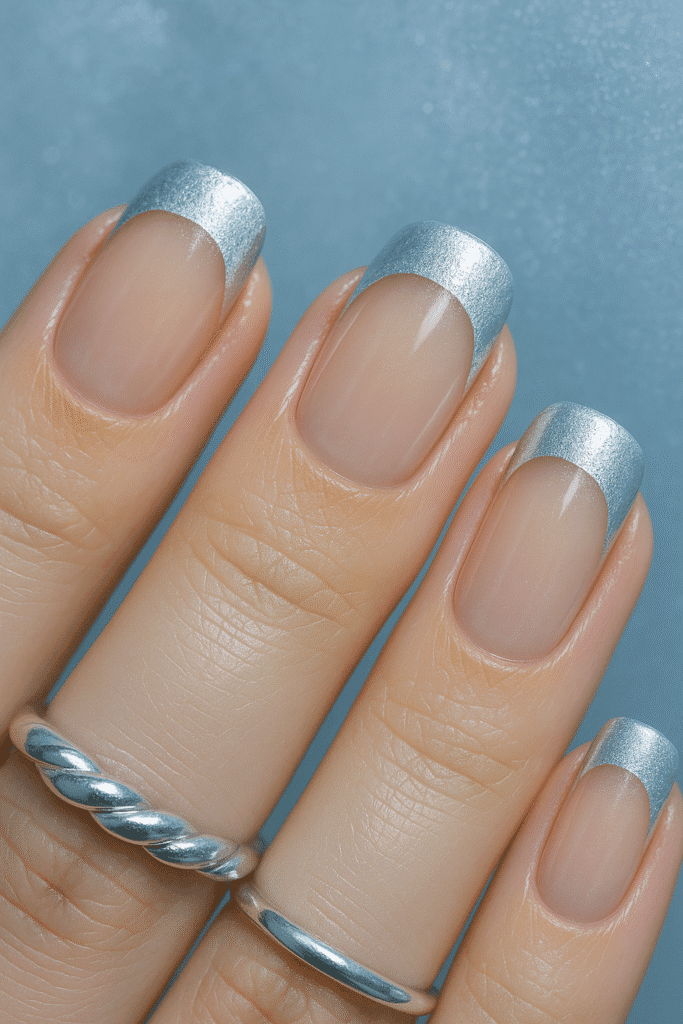 Silver adds softness—but still stands out for winter inspo nails 2025. Apply a sheer neutral base and use metallic or glitter silver polish for the tips. For a twist, fade the glitter downward into a mini gradient or double-line your French for a “two-tone” chrome effect. Pair with cold-toned rings or dainty bracelets for a sophisticated finish.