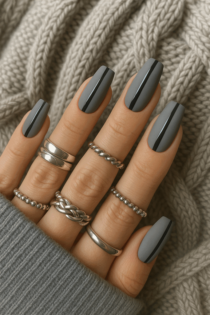 Soft grey nails match nearly every winter outfit and work perfectly with a matte finish. Use a glossy accent stripe down the center OR make one nail fully glossy for contrast. Grey works especially well if you wear silver jewelry, winter trench coats, or ribbed sweaters. Grey in winter inspo nails 2025 is all about texture—and matte finishes add depth without distraction.