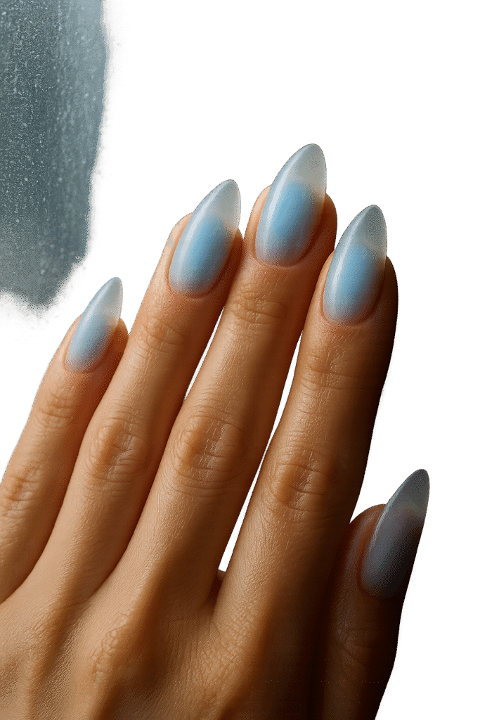 A dreamy twist on aura nails. Start with a sheer base and blend pale blue, lavender, or blush into the center using a sponge. This creates a soft “light glow” effect. Add a high-gloss top coat to enhance the aura or matte top coat for a foggy, frosted-glass vibe. The blurred edges feel like winter mist—perfect for fashion-type photo moments.