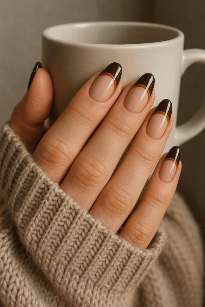 For winter inspo nails 2025, chocolate brown French tips have become the grown-up version of the classic manicure. Apply sheer nude base and paint dark brown tips. To elevate, use double tones: add a thin caramel line right above the dark tip for elegance without clutter. Works beautifully on almond or square nails—and gives hands a slimmer appearance.