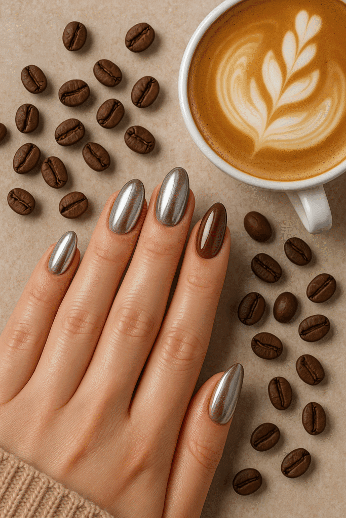 Inspired by the viral glazed-donut trend—iced mocha brings warmth into winter nails. Start with sheer brown or taupe and apply chrome powder lightly. The result is subtle shine with a milky glaze. Add a mini French tip in darker chocolate for dimension. Great on any nail length and pairs well with gold jewelry and latte-colored winter outfits.