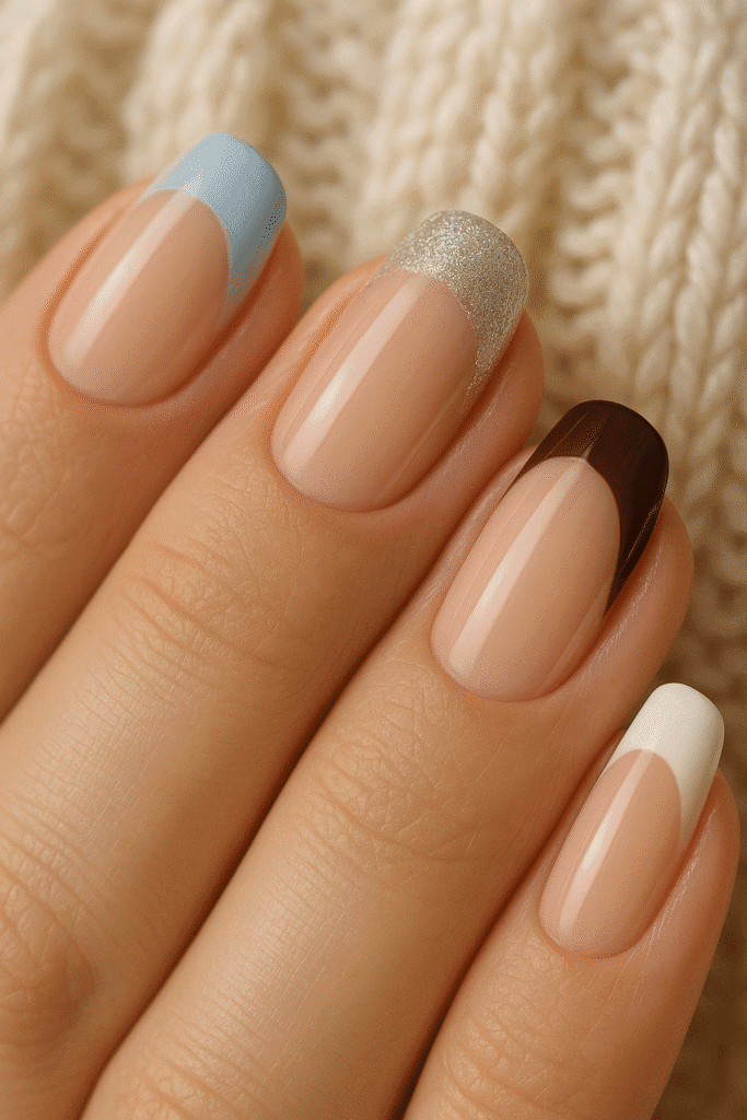 Can’t choose just one French tip? Mix them. Use icy blue, chocolate, white, and silver tips across different nails—but keep the base color consistent. It becomes a wearable mood board and a scroll-stopping photo moment. This is one of the most creative takes on winter inspo nails 2025 and looks fantastic on almond nails.