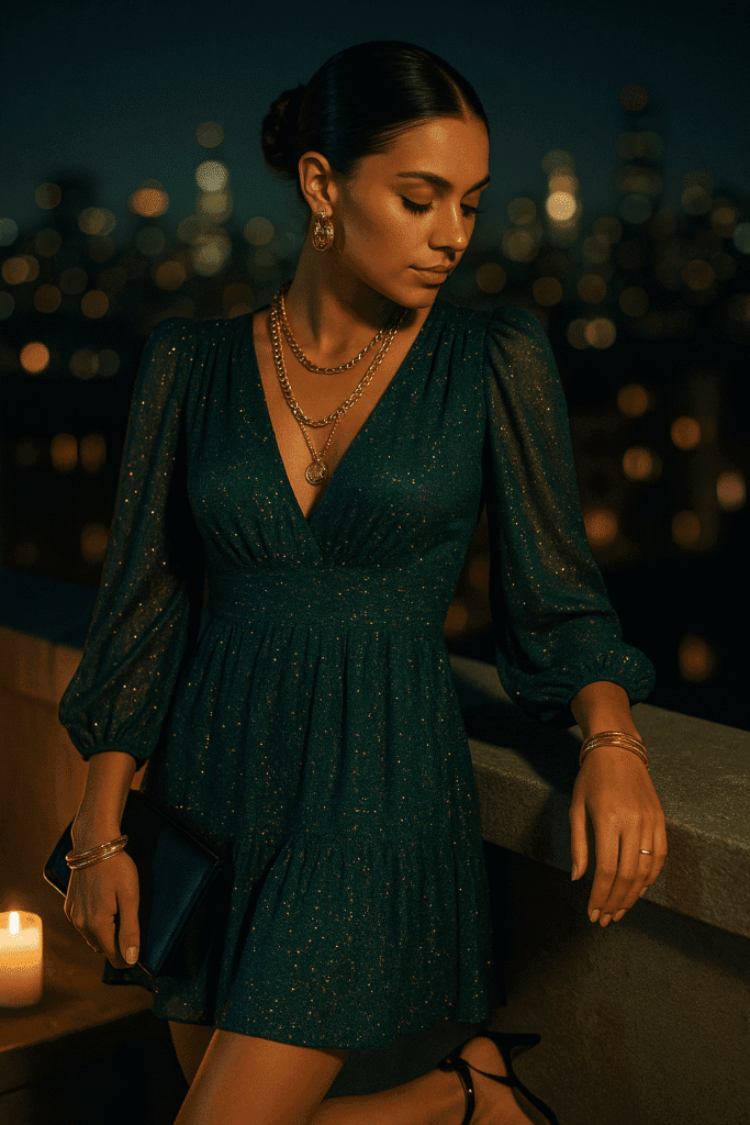 Your boho dress doesn’t have to sit out date night. Switch gears by accessorizing it for evening wear. Think chunky gold hoops, layered necklaces, and a pair of block-heeled sandals or mules. Choose darker or jewel-toned makeup to match the moody lighting of nighttime outings. You can also opt for a sleek bun or soft waves and a structured clutch to level up the look. This technique proves that a boho dress can be both relaxed and refined. Problem solved: how to transition a daytime staple into a glam, night-out moment.