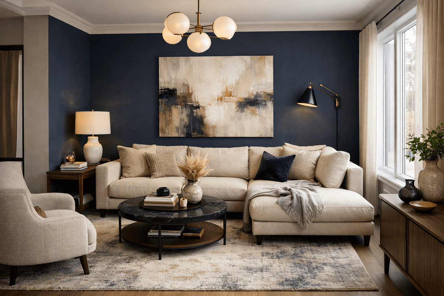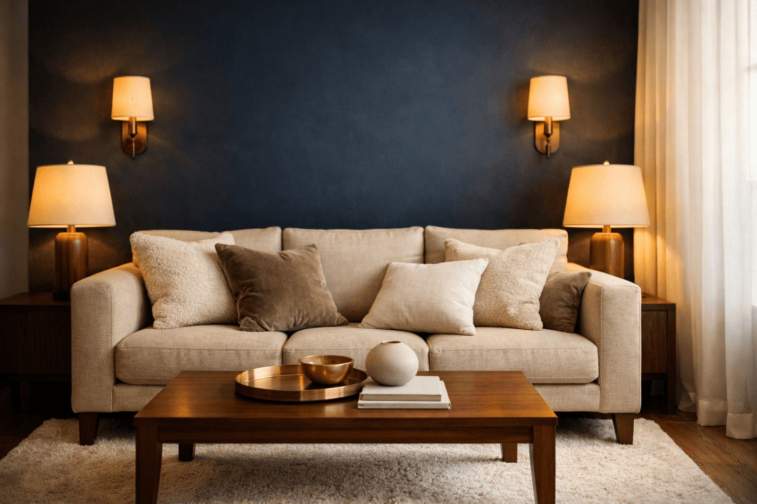 Deep navy looks cozy when paired with warm lighting, soft textiles, and wood tones.