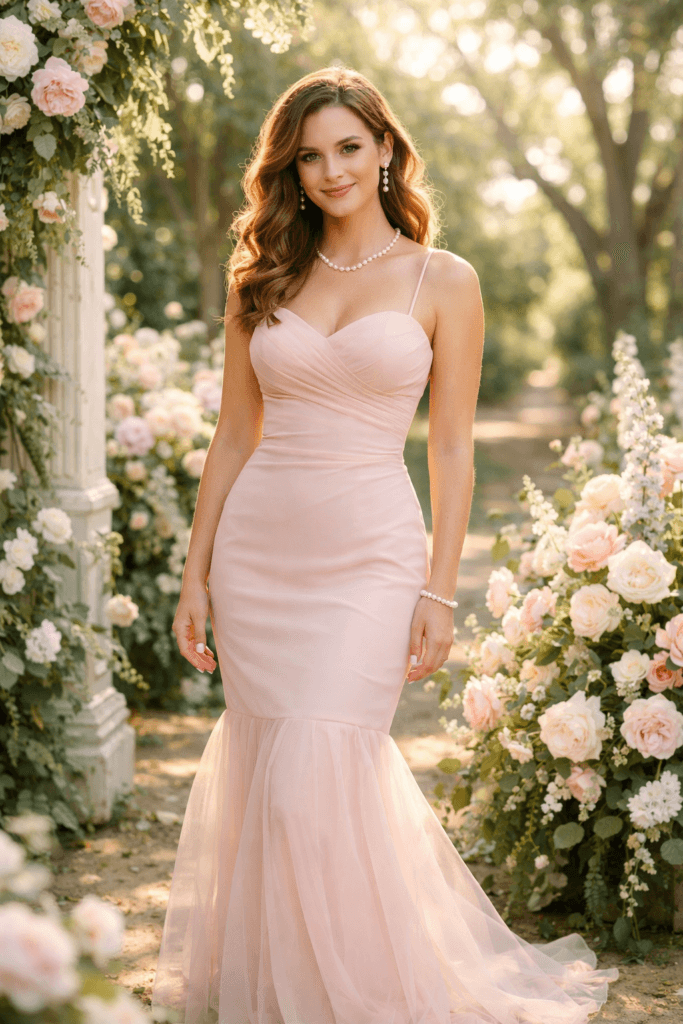 A strapless chiffon mermaid bridesmaid dress works beautifully in that story because it adds elegance without distraction. It supports the bride’s vision while still allowing each bridesmaid to feel beautiful in her own way.