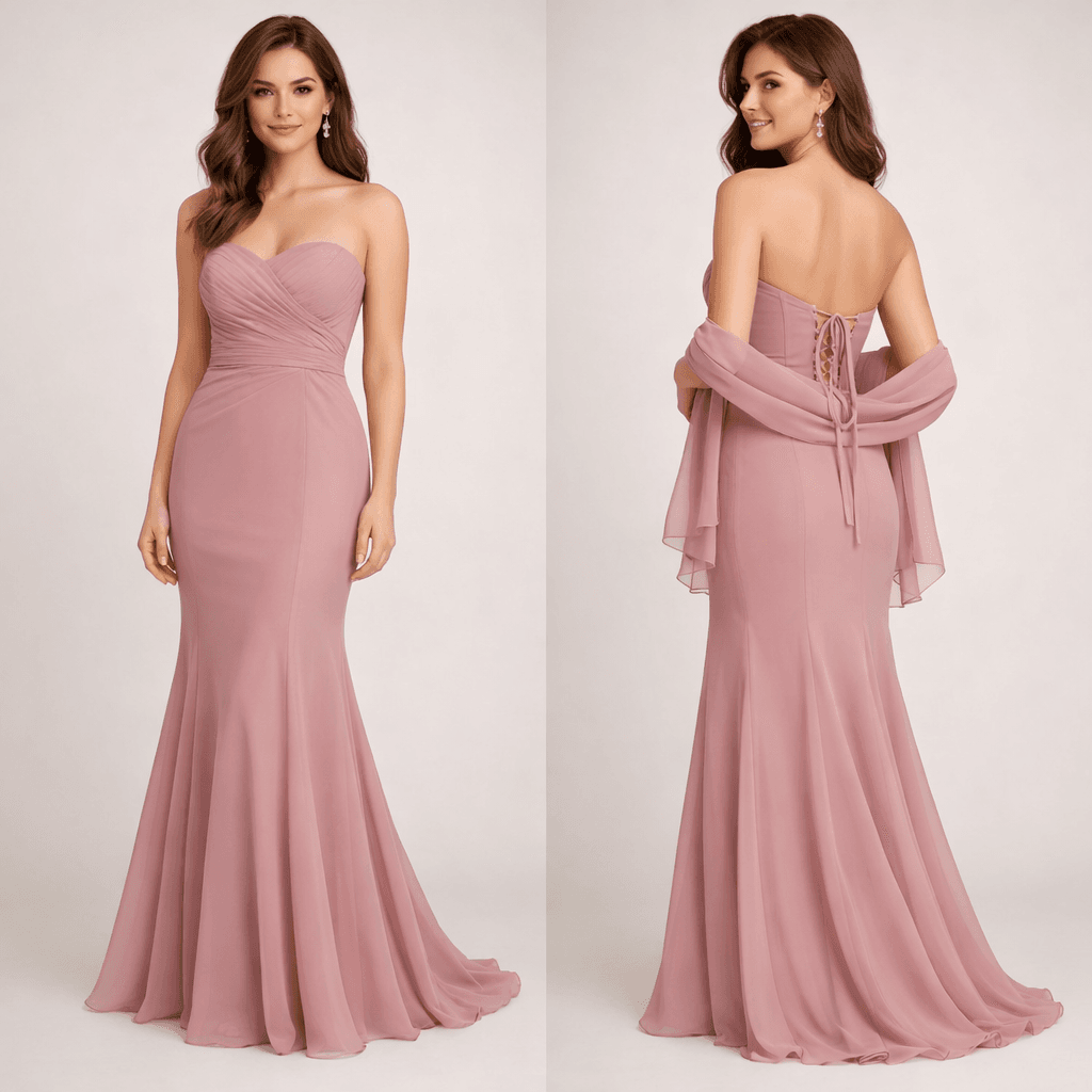 That’s exactly why the strapless chiffon mermaid bridesmaid dress trend is so popular right now. It’s a style that tends to look polished on camera, feel light on the body, and read “elevated” without requiring a designer budget.