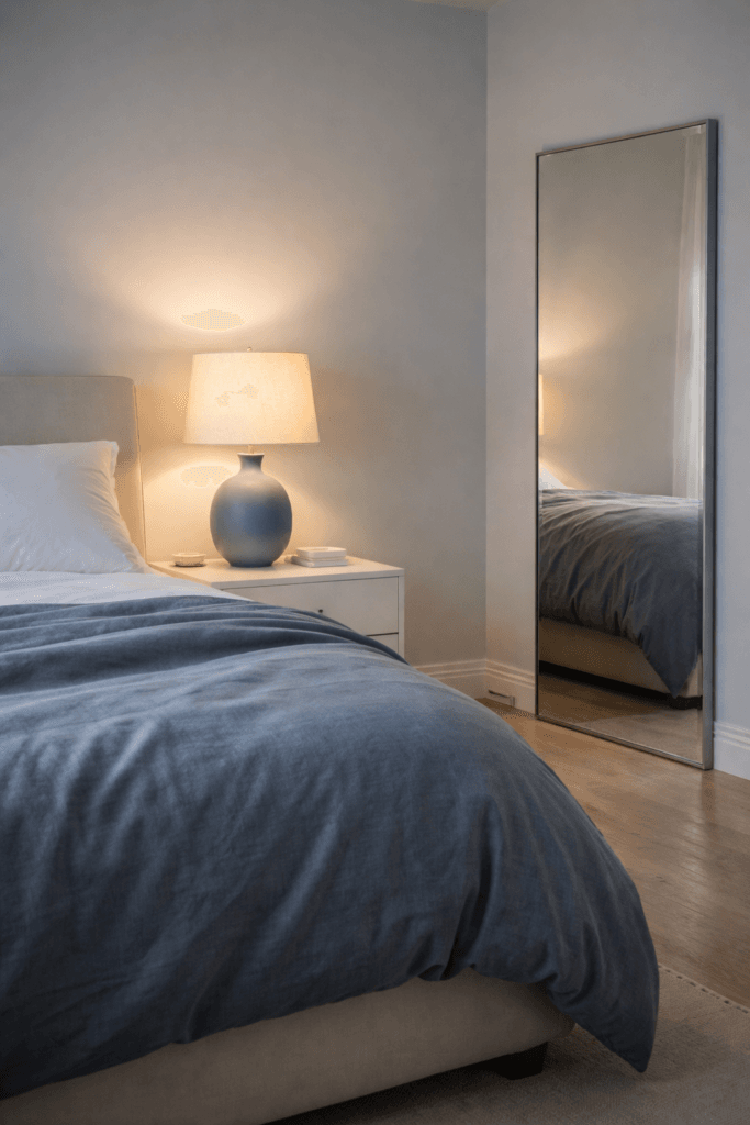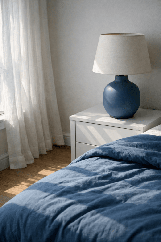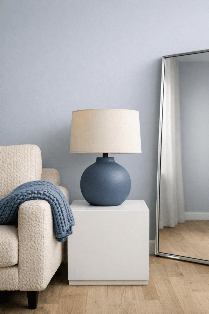 A matte blue lamp with a linen shade creates contrast against white walls. Use a 2700K bulb for warmth to balance the cool palette.