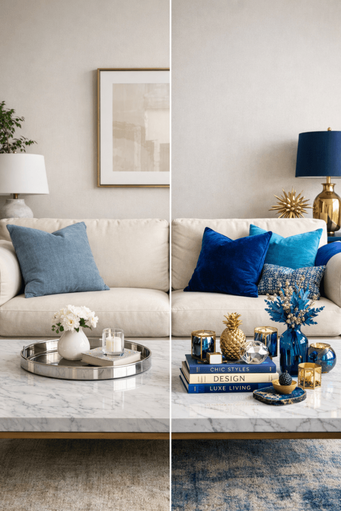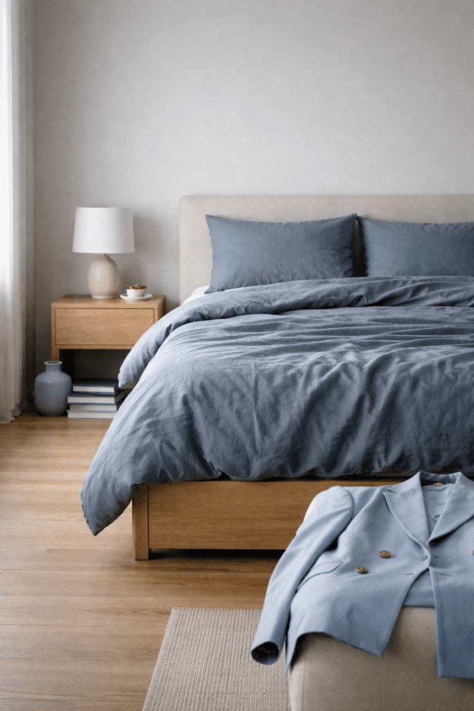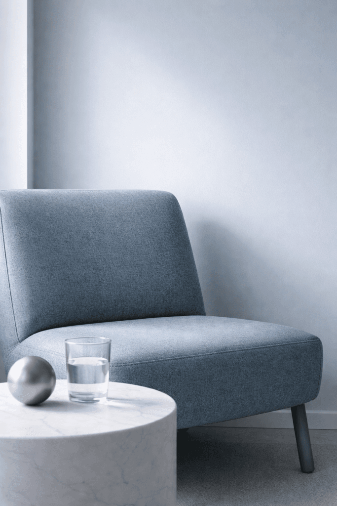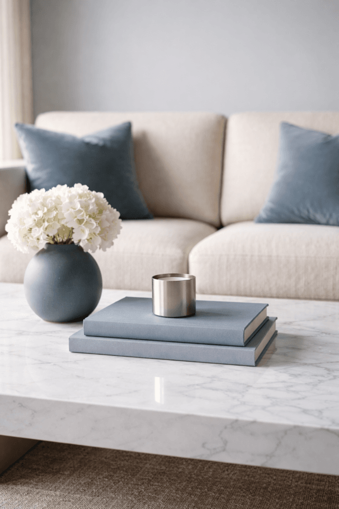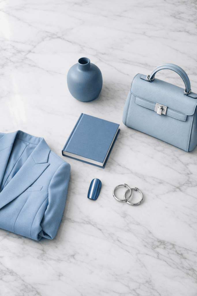Layer cool blue in three finishes—matte, linen, and subtle chrome—to prevent it from feeling flat. Keep undertones consistent (lean gray, not teal). Photograph near natural side light to enhance depth. Add one crisp white contrast piece to sharpen the palette instantly.