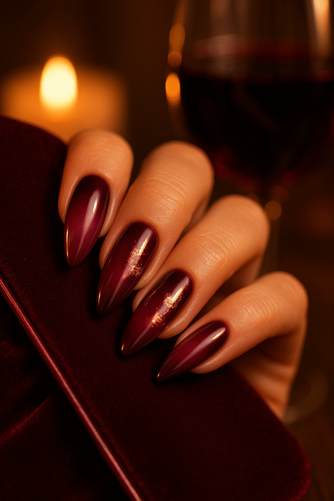 Deep burgundy, wine, and mulberry tones are timeless for fall. Glossy finishes elevate these hues, while matte keeps them grounded. Try ombré wine nails for extra depth.