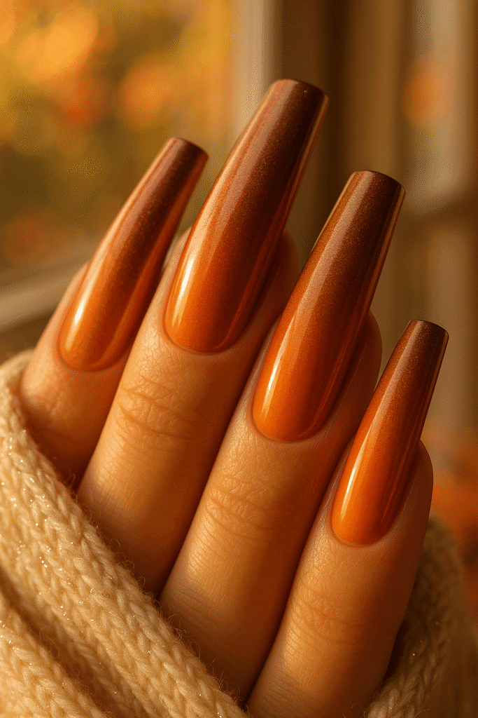 A translucent caramel polish offers warmth and dimension. Jelly finishes—once a summer favorite—now get the fall treatment in hues like honey, maple, and toffee. Add gold foil or glitter at the base for a touch of seasonal sparkle.