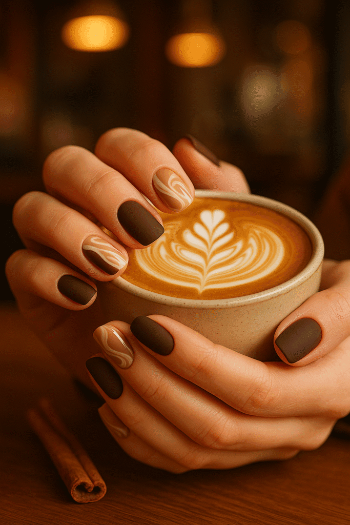Neutral and rich brown polishes mimic coffee tones. Pair matte espresso nails with creamy latte accents, or swirl the two in an abstract design. Ideal for coffee lovers and neutrals fans alike.