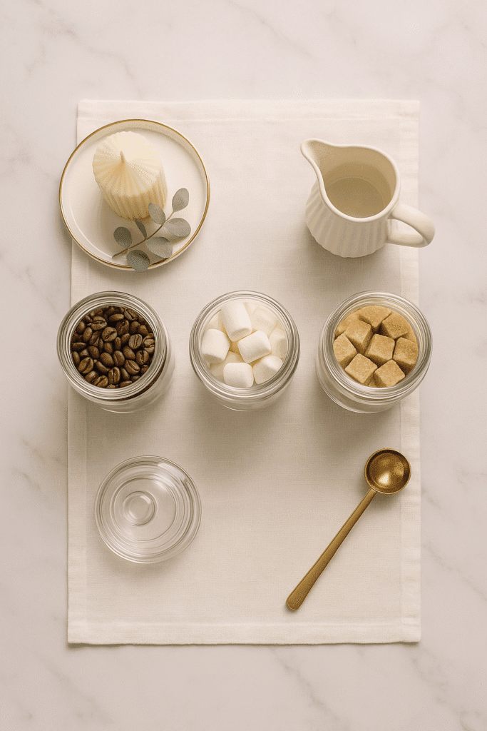 The materials you use play a huge role in how “expensive” your coffee bar feels. Ditch the plastic bins and faded dishware. Instead, swap in clear glass canisters for coffee pods, ceramic mugs with clean lines, and gold-toned spoons or scoopers. Even a $1 glass jar looks high-end when it’s filled with cinnamon sticks or marshmallows. A thrifted sugar bowl or a fluted ceramic creamer pitcher instantly adds elegance. Focus on quality finishes—even if they’re faux. Matte textures, brushed metallics, and fluted shapes are key style indicators in luxury home trends right now. The goal is to make your space feel styled—not just stocked.