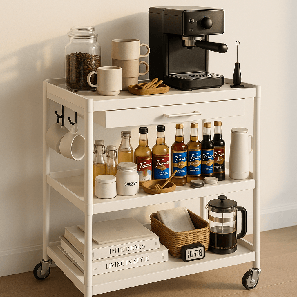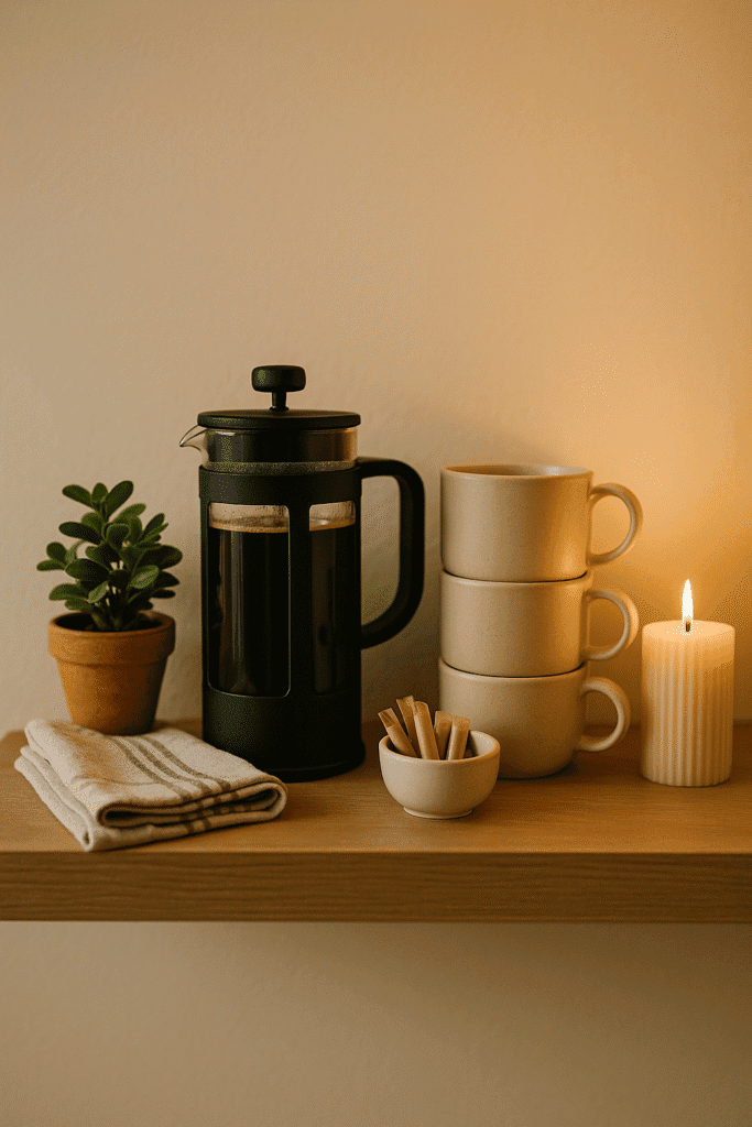 The most successful coffee bars marry style with everyday function. Keep the essentials within reach but intentionally placed. Use tiered stands to hold pods, stirrers, and filters. Choose one or two standout pieces—like a glass French press or a matte black espresso maker—to act as visual anchors. Then soften the space with cozy accents: a soft tea towel, a candle, or a small potted faux plant. These finishing touches help your bar feel lived-in but polished, just like the cozy corners of upscale cafés. The final rule? Edit often. Clear off what you don’t use weekly. A luxury look only works if it also feels clean, organized, and inviting.
