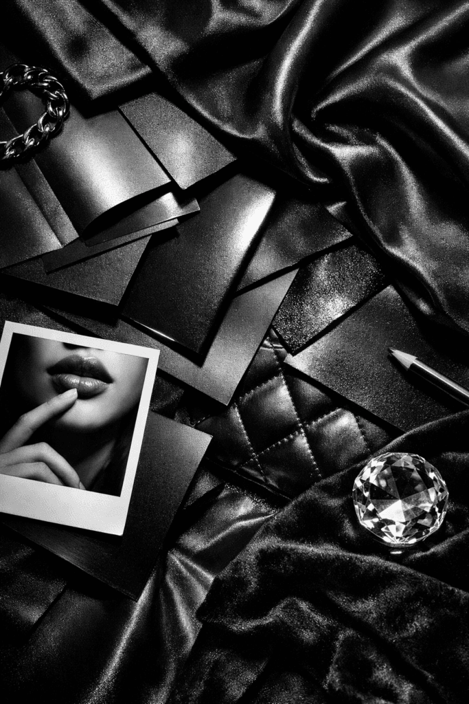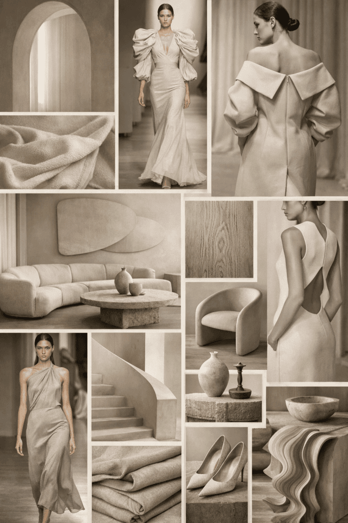 Monochrome does not mean flat. The richest boards include texture contrast. Think velvet beside denim. Satin next to wool. Leather layered with metal. Transparency layered with matte. This adds movement, dimension, and visual story depth.