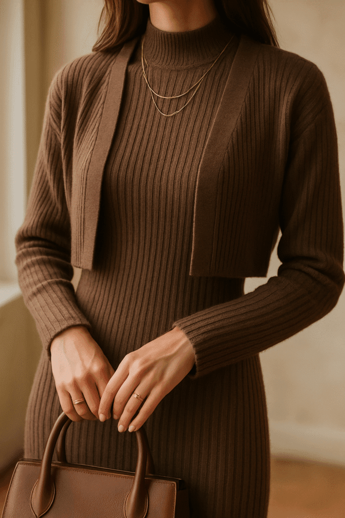 Fashion influencers are calling this the “it” dress of the season—and for good reason. The heavy ribbed knit feels luxe and the silhouette flatters nearly every body type. Unlike most sweater dresses, it’s not bulky or clingy. Instead, it drapes softly, highlighting your shape without exaggeration. The cropped cardigan also adds structure, creating a polished layered look that doesn’t require extra styling.