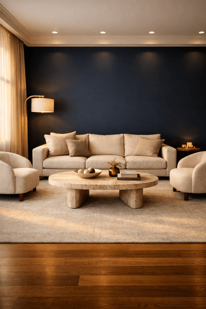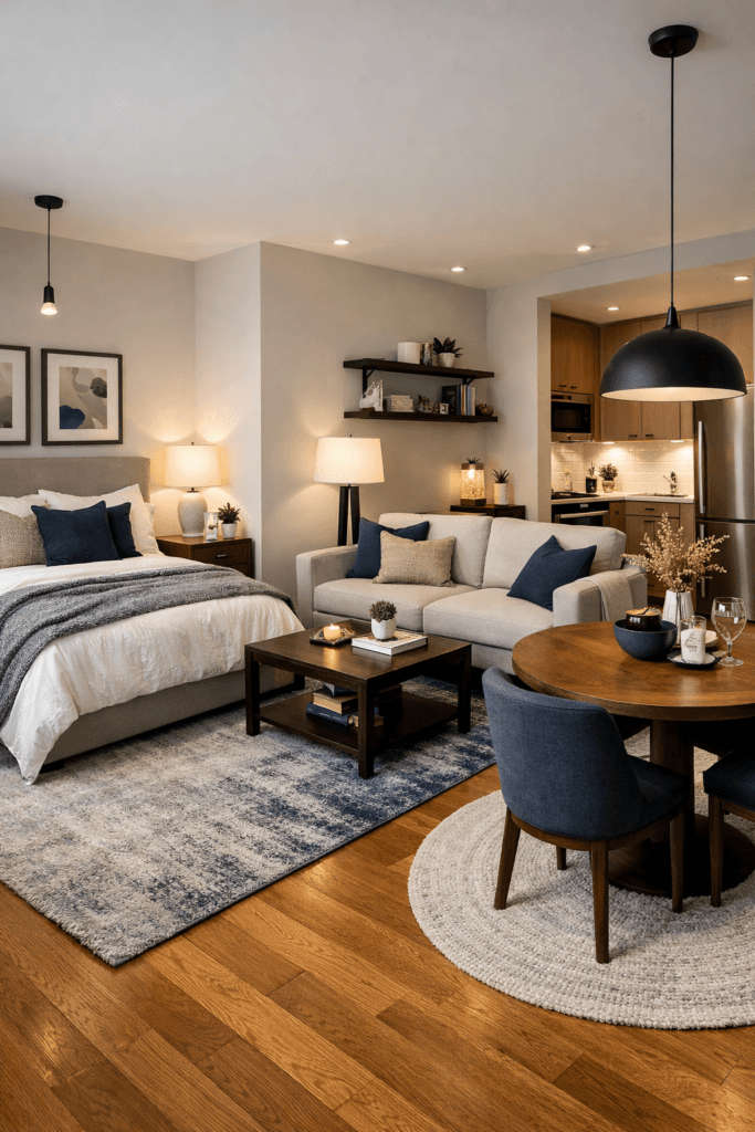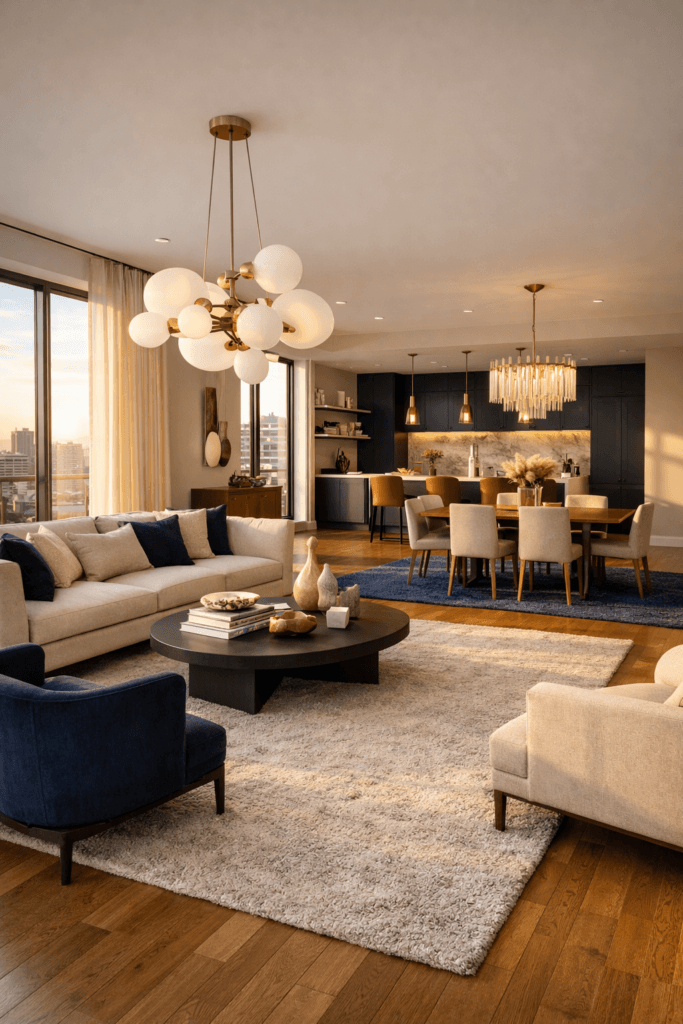 A properly scaled rug creates a unified visual island. It tells the brain: