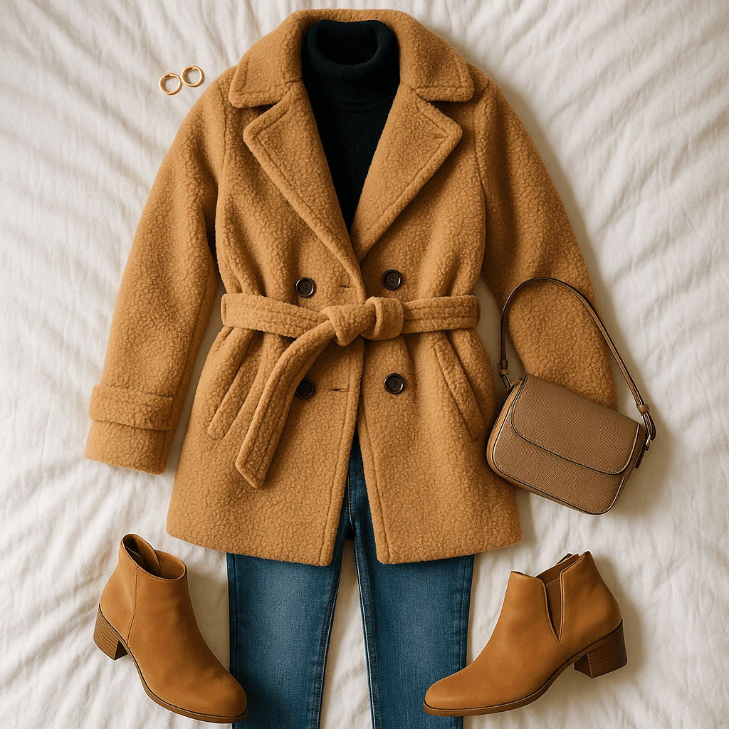 Outfit 8: Teddy coat layered over a thin puffer vest + straight-leg trousers + pointed flats or low heels. Search Amazon for βlightweight packable vestβ and size it slim so it fits under the coat. This hidden layer keeps you warmer on long walks, while the coat still looks stylish.