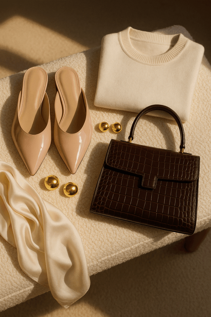 Your shoes, bags, and jewelry are the finishing touches that can either blend or boldly contrast. Pointed-toe mules in nude patent, a croc-texture mini bag in espresso, or gold dome earrings will elevate even the simplest neutral base. Stick to a tonal story—like gold jewelry with warm neutrals, or silver with cooler tones—to tie everything together. Remember, the glam is in the details.