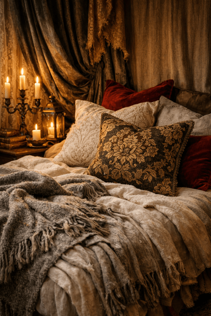 - Layered bedding in dark neutrals or jewel tones