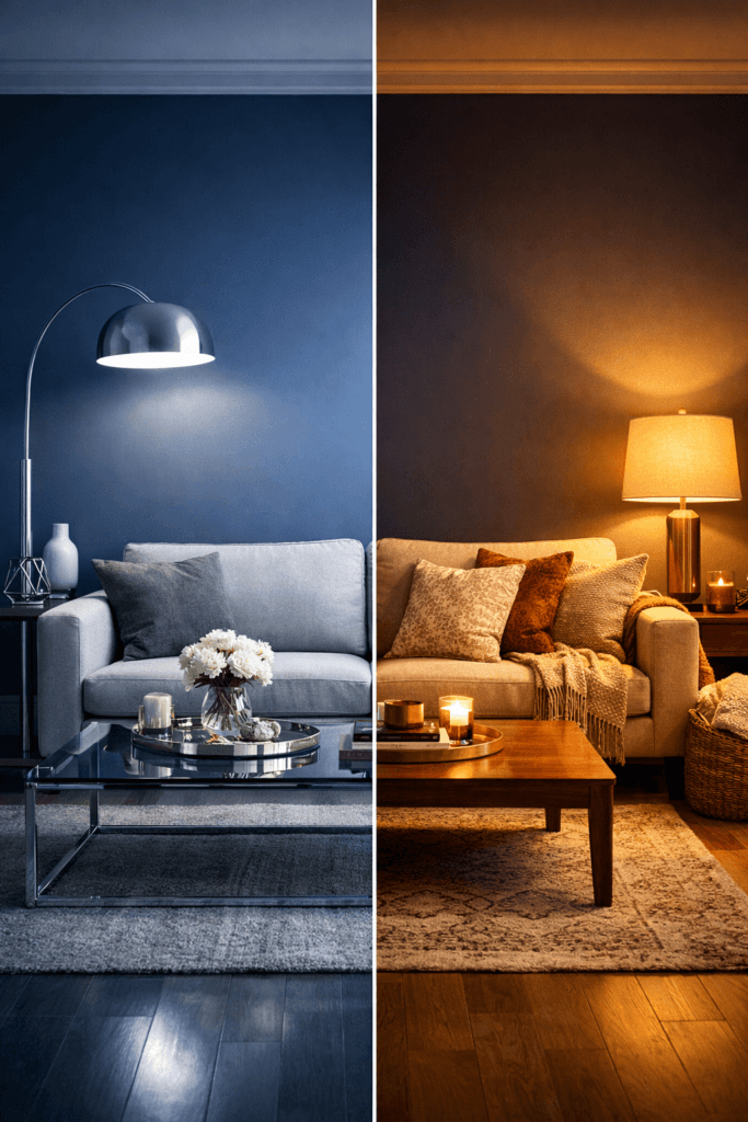 Cool white bulbs (4000K and above) strip warmth from beige and flatten navy. The result is clinical instead of cozy.