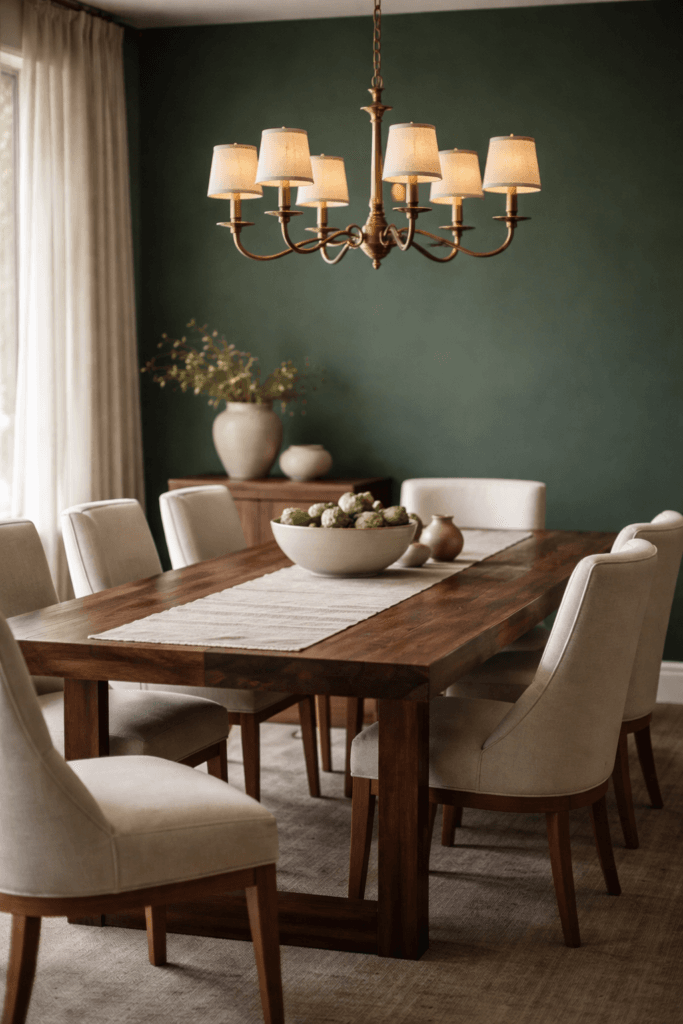 If you use emerald, introduce brass or aged bronze. The metallic warmth counteracts green’s potential heaviness.