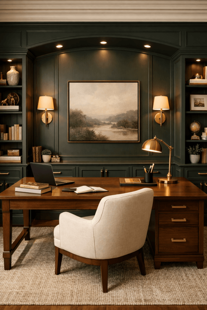 Deep navy walls. Charcoal cabinetry. Forest green paint. Plum dining rooms. Matte black offices. These tones are not inherently harsh. In fact, high-end interiors rely on them constantly. The difference between dramatic and cold comes down to one principle: warmth layering.