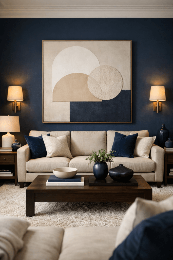 When beige dominates the room, navy becomes intentional rather than overwhelming.