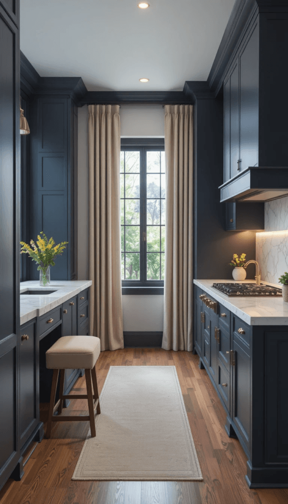 A navy kitchen with stone counters and brass hardware feels elevated. Add a textured runner and upholstered stools, and it suddenly feels welcoming.