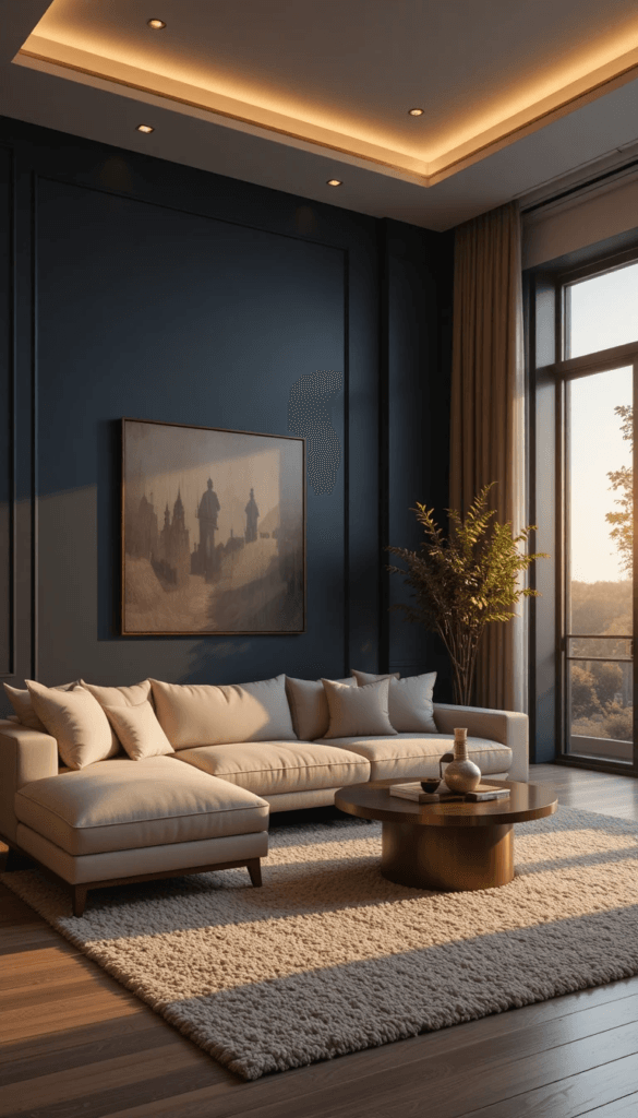 A deep navy accent wall paired with warm oak floors and cream upholstery can make a compact living room feel grounded and expansive. Without warmth, however, that same navy wall can feel abrupt.