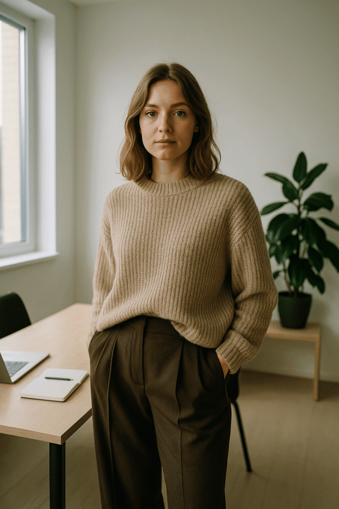 For days when you want to look polished but feel like you’re wearing loungewear, a monochrome knit set is your best friend. Think matching sweater and knit pants or a sweater skirt combo in cream, taupe, gray, or deep chocolate. Layer a statement coat over it—something with a bold color, textured fabric, or an interesting shape. The matching base makes you look instantly put together, while the coat adds personality. Finish with sleek boots or minimalist sneakers, depending on your day. This is a great option if you’re working from home but still want to be camera-ready or running errands and want to look elevated without trying too hard.