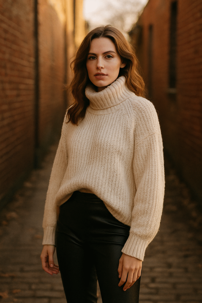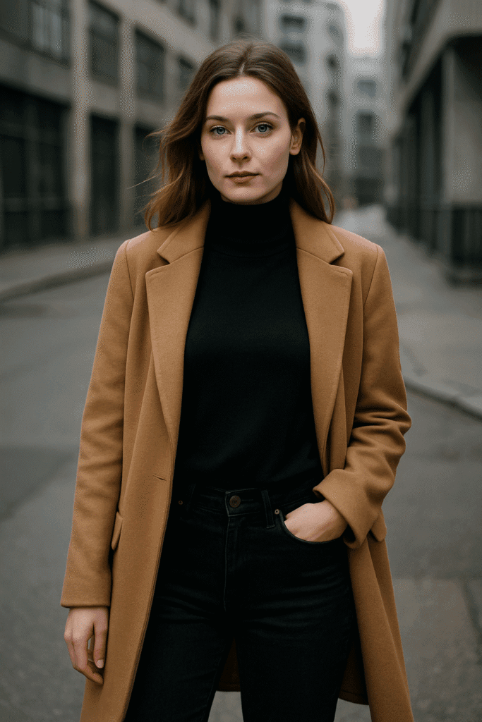 For those especially cold days when you still need to look sharp, layering a turtleneck under a blazer and topping it with a wool coat is a power move. Start with a fitted turtleneck, add a structured blazer, and then wear your coat over everything like an outer shell. Pair it with tailored trousers or straight-leg jeans and ankle boots. The stacked layers look intentional and sophisticated while providing real warmth. This is a strong option for meetings, dinners, or more polished outings. For layering tips that won’t make you look bulky, it’s worth browsing thoughtful style breakdowns from fashion editors at sites like Vogue or Who What Wear, where they often show layering strategies with visuals.