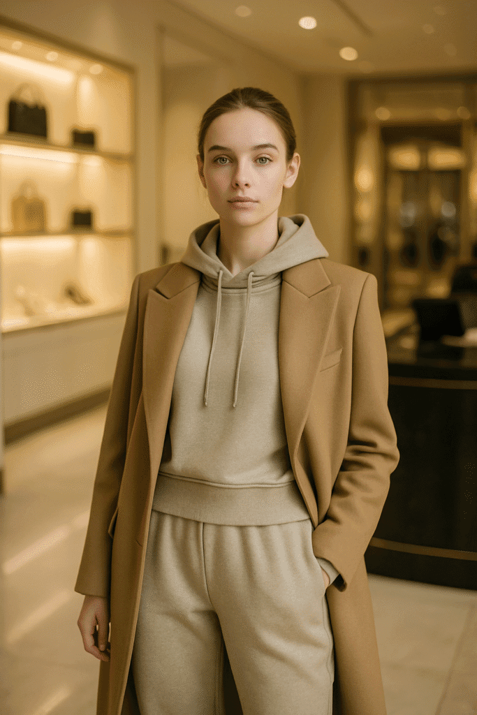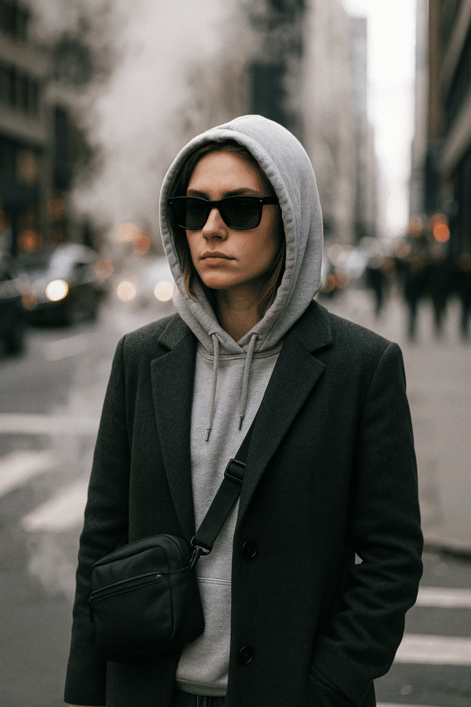 One of the easiest ways to blend comfort and structure is to layer a hoodie under a wool or tailored coat. The hoodie gives you that off-duty, casual feel, while the coat adds polish and shape. Wear it with jeans or leggings and sneakers or combat boots. The key is keeping your color palette cohesive: neutral hoodie with a neutral coat or tonal variations of the same shade. This combination is especially good for off-duty days where you might still want to look presentable—like spontaneous lunch plans or casual dates. It also gives that “model off-duty” energy in photos, especially when paired with sunglasses and a simple bag.