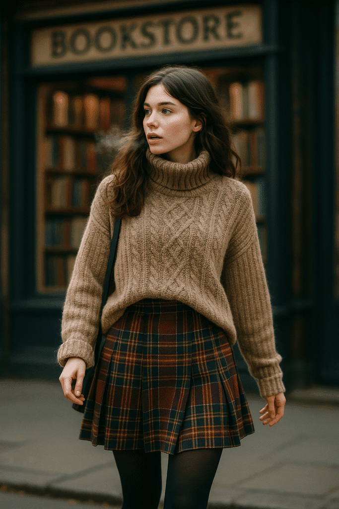 If you like a slightly preppy or feminine vibe, a plaid skirt with tights and an oversized knit is such a cute winter outfit formula. Choose a thicker skirt material (wool blend if possible) and pair it with opaque tights in black or charcoal. Add an oversized sweater that drapes softly over the waistband, and then finish with ankle boots or loafers. You can layer a long coat on top if needed. This outfit looks adorable with a crossbody bag or structured mini bag and works well for coffee dates, casual evenings, or content days where you want a bit more personality in your outfit.