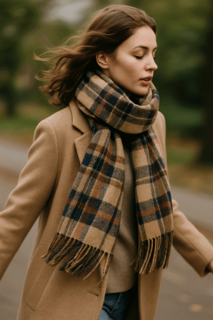 Sometimes the right scarf can turn a basic outfit into a styled one. Choose a long, oversized scarf in a color or pattern that adds contrast to your coat—think plaid over a solid coat or a bold color over a neutral. Wear it looped once or draped long on both sides. Pair with your usual base: denim and a sweater, leggings and a long knit, or trousers and a turtleneck. The scarf adds movement, texture, and color, making even very simple outfits feel intentional. It’s also an easy way to play with trend colors without committing to a whole piece of clothing.
